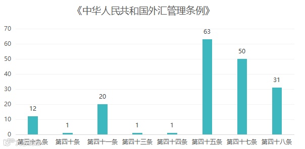 上述各违法事实中,按《中华人民共和国外汇管理条例》第四十五条 处罚的案例最多,有 63例,其次是 第四十七条,有 50 例。(含数罪并罚重合案例)
