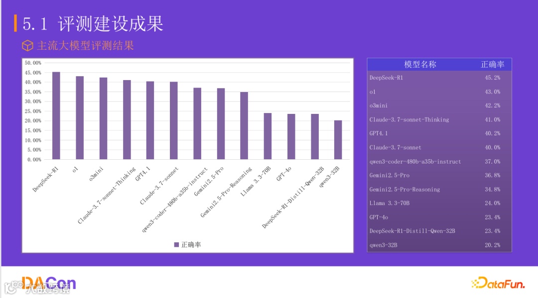 团队使用Falcon评测集对主流大语言模型进行了全面评测,结果显示:DeepSeek-R1以45.2%的正确率位居第一,紧随其后的是o1(43.0%)、o3mini(42.2%)、Claude-3.7-sonnet-Thinking(41.0%)、GPT4.1(40.2%)、Claude-3.7-sonnet(40.0%)等。相比Spider 2.0仅20%的最佳成功率,Falcon评测集45.2%的最高正确率显示出更为合理的难度设计。