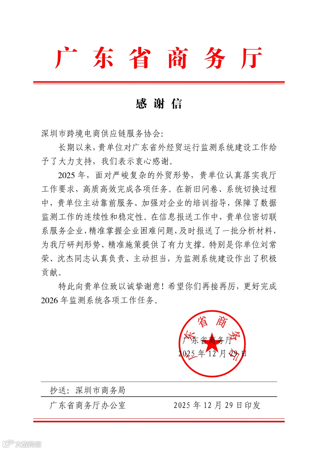 近日,深圳市跨境电商供应链服务协会收到广东省商务厅发来的感谢信,对其长期参与广东省外经贸运行监测系统建设工作表示衷心感谢。
