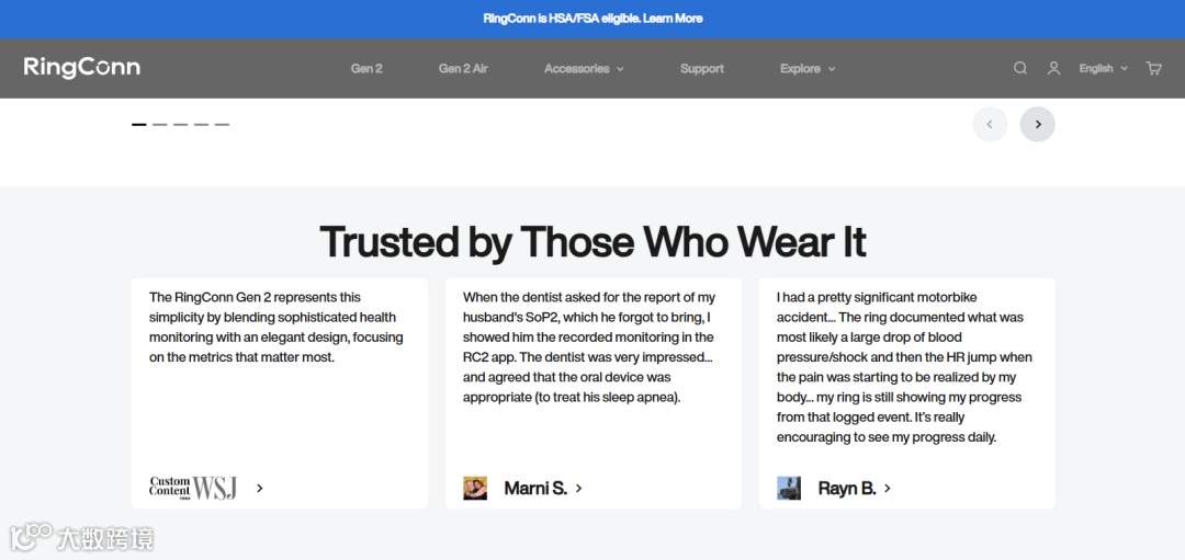 在独立站首页,RingConn设置了名为“被佩戴者信赖”的用户案例板块,上面有《华尔街日报》等权威媒体的报道摘录,还有消费者的使用心得。