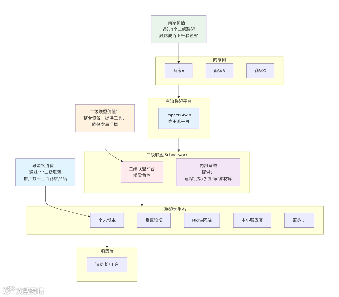| 对比维度 | 二级联盟(Subnetwork) | 常规联盟平台(Affiliate Network) |