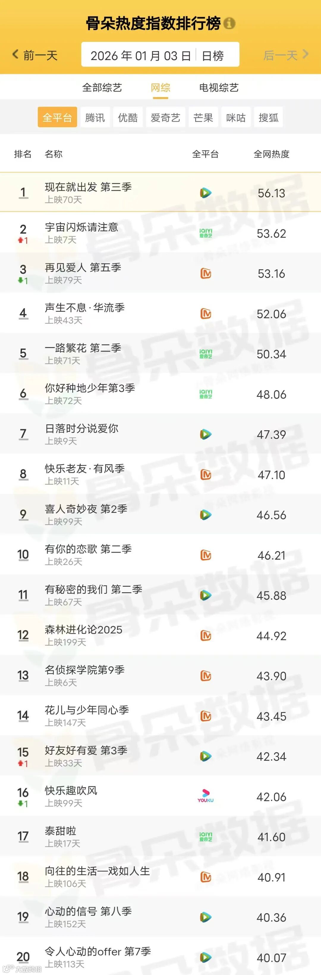 骨朵榜单丨2026年1月3日剧综热度指数表现