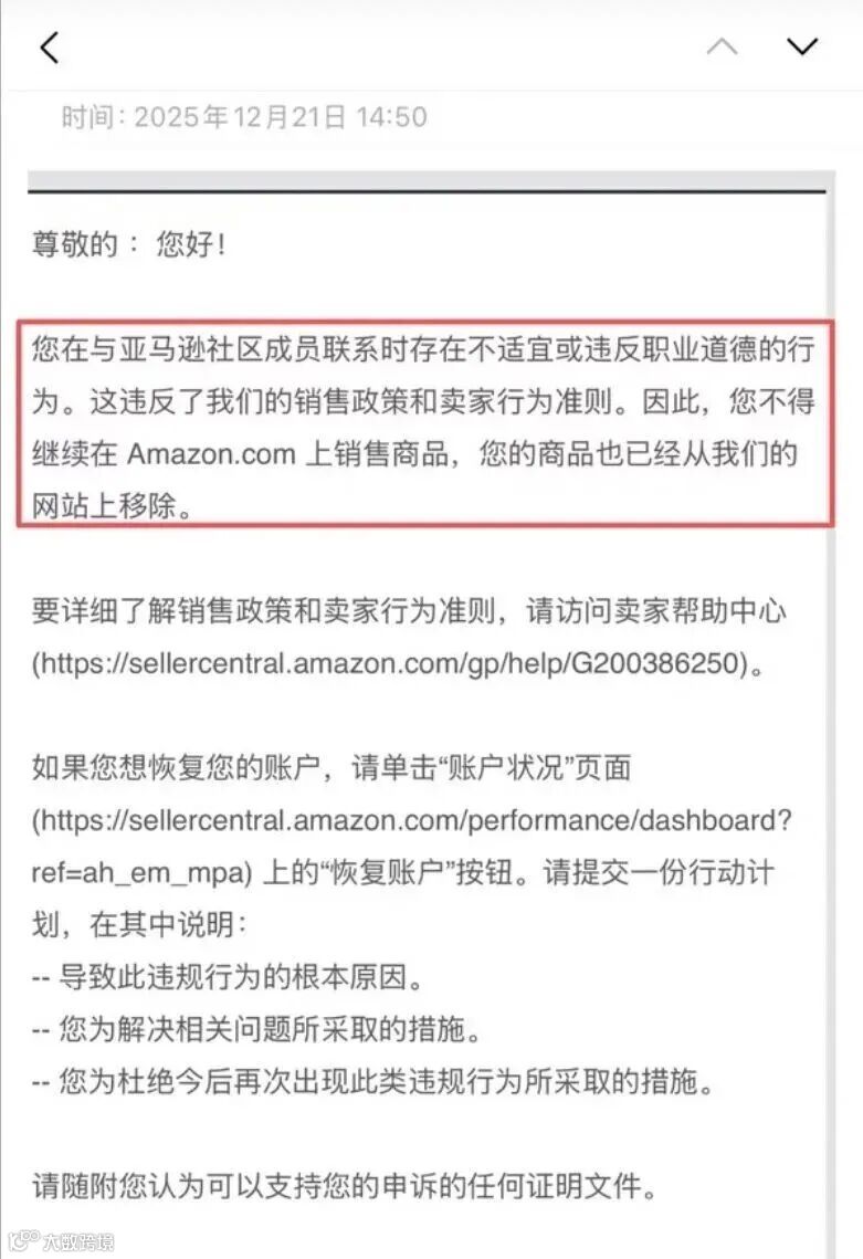 需要强调的是,亚马逊对此类缺乏职业素养的沟通行为持“零容忍”态度,官方处理非常严格,一旦发现,通常立即执行封店。