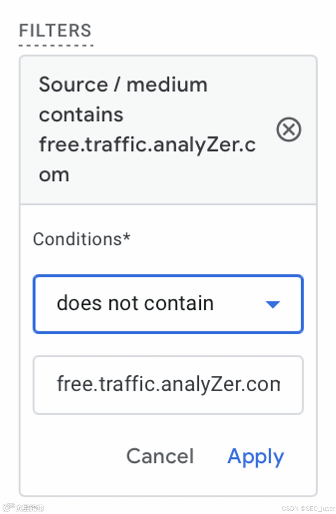 如果你要过滤某个来源,选择“来源/媒介”。选择“不包含”,然后输入你想排除的来源。