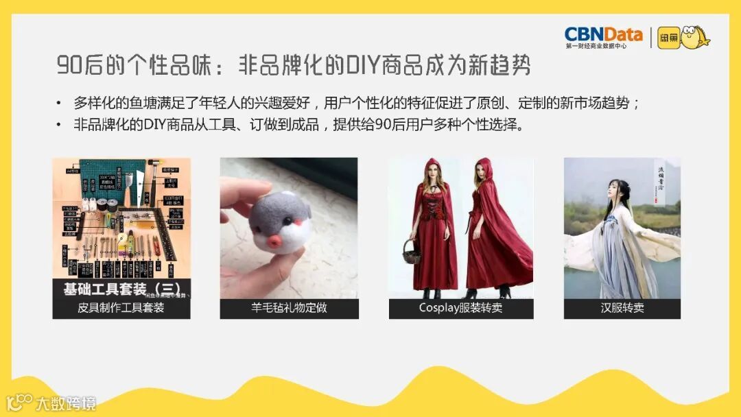 在个性品味方面,90 后不再盲目追捧大牌,而是更喜欢小众品牌和 DIY 商品。数据显示,小众品牌近 30 天成交量较去年同期涨幅可观。非品牌化的 DIY 商品成为新趋势,从皮具制作工具套装、羊毛毡礼物定做,到 Cosplay 服装转卖、汉服转卖,多样化的选择满足了 90 后追求独特、拒绝撞款的个性化需求。