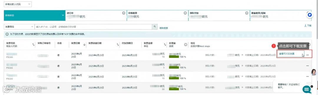 2. 在顶部导航栏点击【发票】→ 选择对应国家市场 → 设置申报区间 → 点击【下载】,即可获取数据报表。