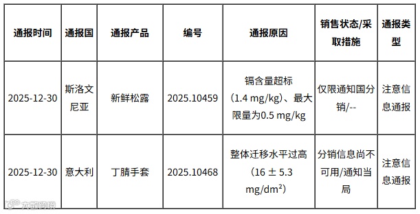 据欧盟食品饲料类快速预警系统(RASFF)消息,2025年12月30日,欧盟通报我国出口新鲜松露和丁腈手套不合格。具体通报内容如下: