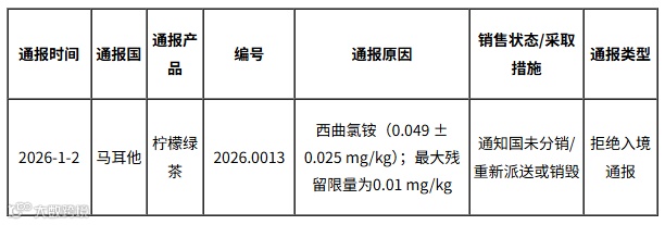 据欧盟食品饲料类快速预警系统(RASFF)消息,2026年1月2日,欧盟通报我国出口柠檬绿茶不合格。具体通报内容如下: