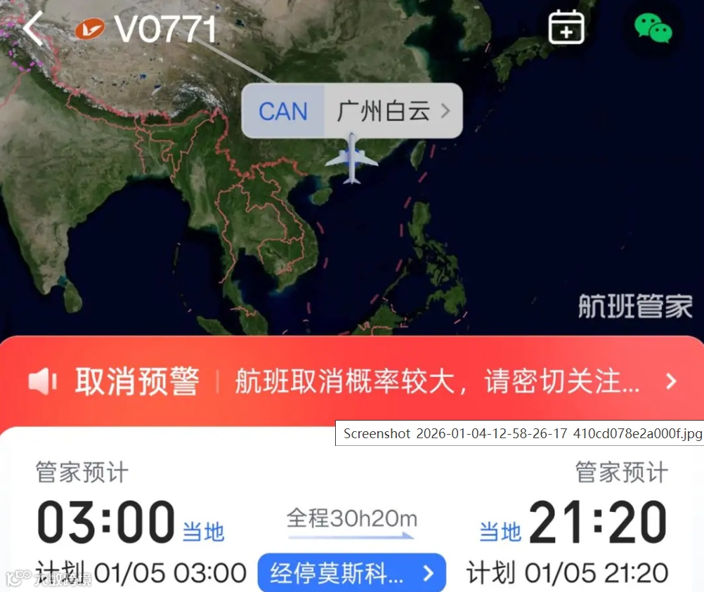 此前于1月4日抵达广州的返程航班V0770已安全落地。据悉,该客机将不载客,以空机形式返回委内瑞拉。相关退改签服务已启动,乘客可办理全额退票或免费改期。
