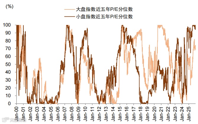 年初至3月初,AI产业链带动小盘领涨;3月至4月关税冲击后,“国家队”维稳侧重权重蓝筹,大盘阶段性占优;6月底至8月底流动性提升、居民存款搬家,小盘再度领跑;8月底起估值偏高,大盘逐步反超。