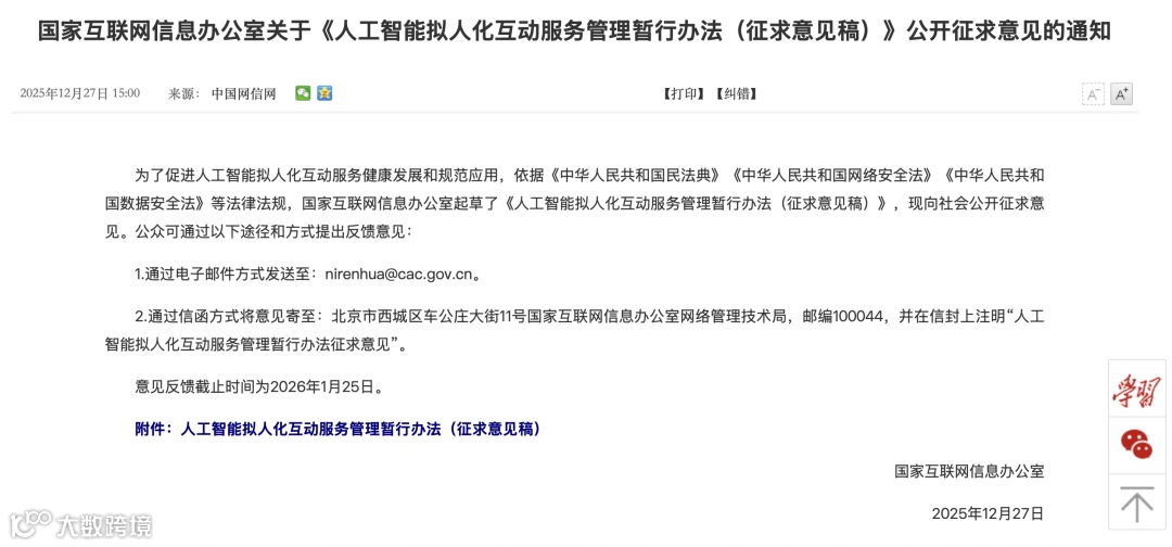 12月27日,国家网信办发布《人工智能拟人化互动服务管理暂行办法(征求意见稿)》,首次明确将“AI情感陪伴”定义为模拟人类特征、思维模式与沟通风格的情感互动服务。