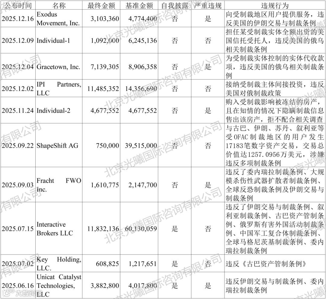 从违规行为类型看,主要集中三大类:一是直接与受制裁国家开展业务,如Unicat公司向伊朗、委内瑞拉出口催化剂产品,违反相关制裁条例;二是为受制裁主体提供间接支持,包括代收款项(Gracetown公司)、接纳间接投资(IPI Partners公司)等;三是规避制裁的故意倾向违规,如Exodus公司主动指导伊朗用户规避管控,Individual-2隐瞒冻结房产交易并拒不配合调查。值得注意的是,2025年新增对“中国军工复合体”相关的制裁理由,Interactive Brokers公司因交易该清单实体证券被处罚,体现出执法范围向特定产业延伸的趋势。