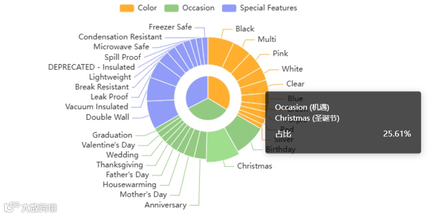 双层,真空隔热是消费者最关心的功能,黑色,粉色销量较大。圣诞节最优的销售节点,生日礼物是最优的产品场景。