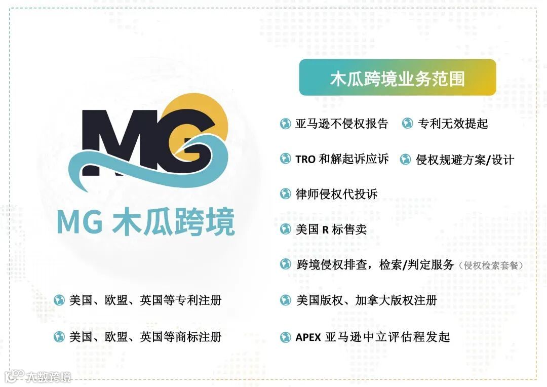专业的人做专业的事,如果您最近正好遇到此类需求,可以找木瓜跨境,专业的团队,专注跨境知识产权保护,为各跨境大卖电商公司规避了侵权风险,平均降低维权成本80%。