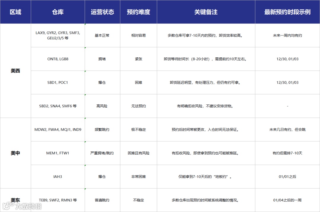 大部分仓库(如LAX9, GYR系列)运营基本正常,卸货快(5-10小时),预约相对容易(可拿7-10天内)。