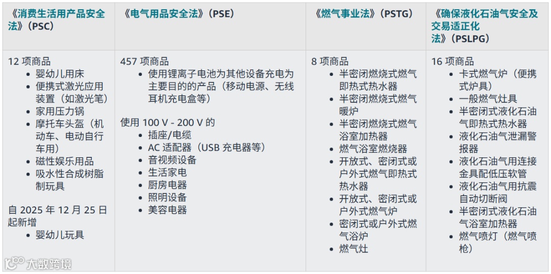 1.《消费生活用产品安全法》(PSC):监管家庭用高风险消费品。2025年12月25日起,婴幼儿玩具将新增为管制对象,与原有的婴幼儿床、压力锅等12类商品一同受规管。