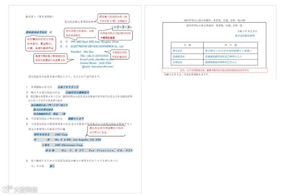 以下为《电气用品安全法》中的事业备案填写示例。(事业备案必须用日语填写)