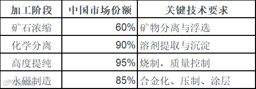 这背后的关键,在于中国在稀土加工环节的绝对优势。数据显示,中国占据全球90%的化学分离产能、95%的氧化物提纯产能,下游永磁体制造市场份额达85%,矿石浓缩环节占比也达到60%。