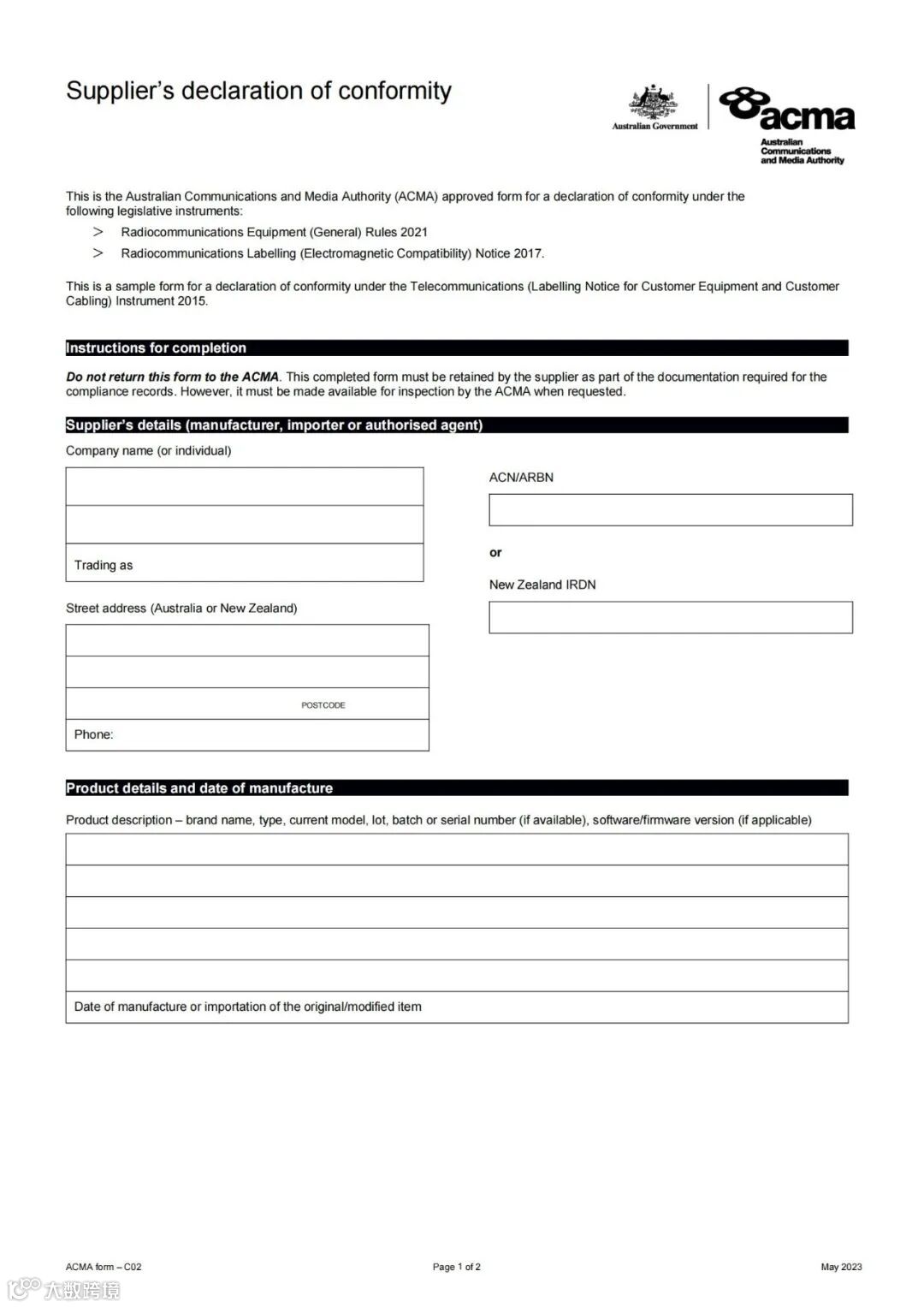 须符合澳大利亚无线电通信法规规定,内容应包含供应商信息、产品详细信息、生产日期、适用标准及合规声明等关键要素。