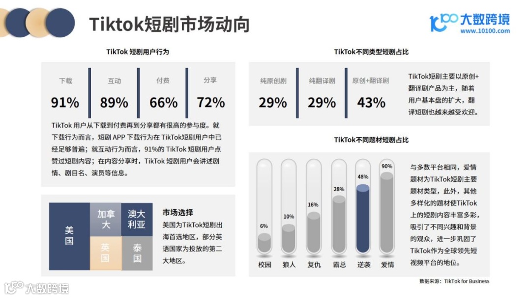 此外,报告还分析了TikTok作为短剧出海的主要平台,其在短剧市场的渗透力和影响力。报告指出,TikTok的全球用户基础为短剧提供了一个广阔的传播平台,尤其是其年轻用户群体,他们对新鲜、有趣、富有创意的内容有着极高的接受度和分享意愿。