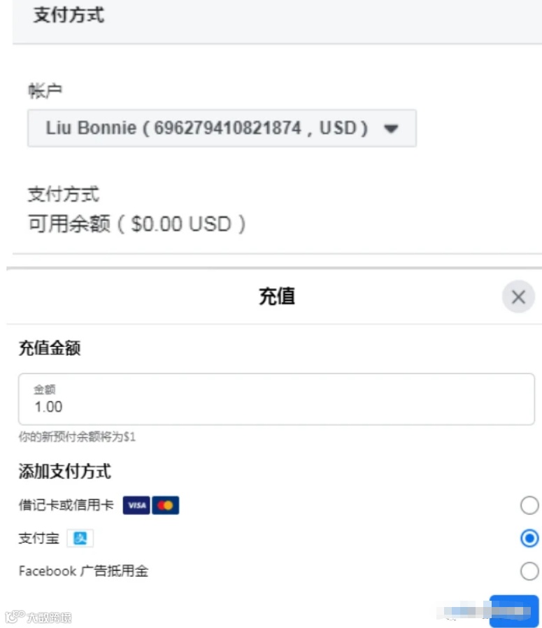 目前仅支持Facebook指定的支付方式。充值后广告即开始投放。