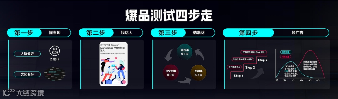 成功打造新品之后,就是“新品-爆品”阶段,《宝典》总结了四大步骤:懂当地、找达人、选素材、投广告。这也和我们前面提到的,把握当地市场的风俗文化与审美、品类偏好以及消费习惯不谋而合。