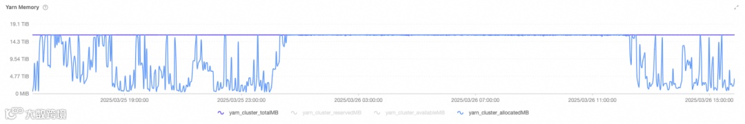 原集群是一个典型的服务器架构,困境是,资源要么长期被打满,要么在空窗期大量闲置。图中 yarn_cluster_totalMB 基本是一条平直的上沿线,代表集群的总内存容量是固定不变的;而 yarn_cluster_allocatedMB 在大多数时间几乎贴着这条上沿线运行,意味着集群绝大部分时间都处在全分配的状态。看上去利用率很高,但从架构与交付视角,这更像是在提示:集群已经被当作一个“刚性资源池”使用,而不是一个能够平滑承接业务波动的弹性资源底座。