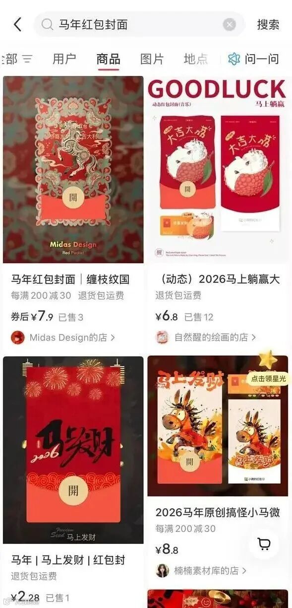 购物平台上的马年红包封面和海报售卖