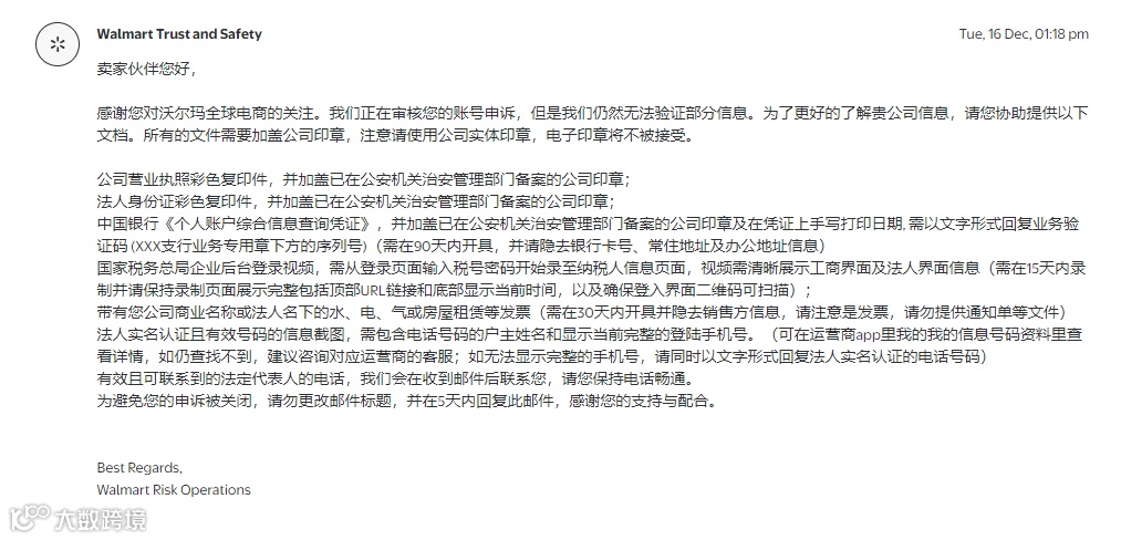 当收到沃尔玛平台发送的暂停通知邮件时,可以仔细对照邮件要求,它会明确列出需要你提供的具体文件清单(通常是营业执照、法人身份证、最近的水电发票、中国银行《个人账户综合信息查询凭证》等)。