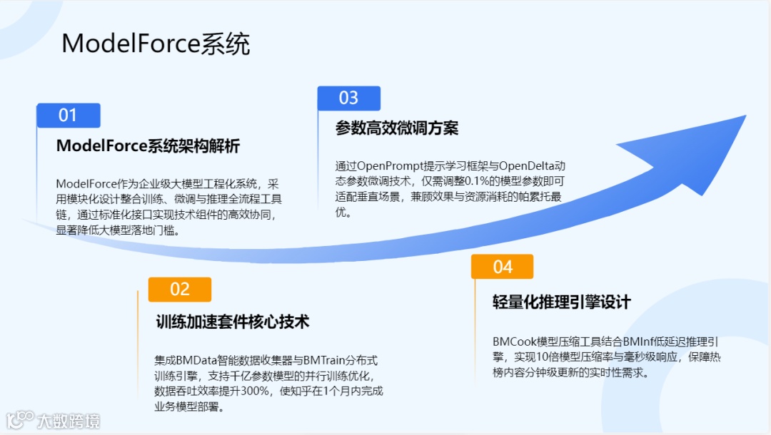 ② 工程化系统:ModelForce工具链(含BMData数据收集器、BMTrain训练引擎、OpenPrompt提示学习工具等),支撑敏捷迭代;