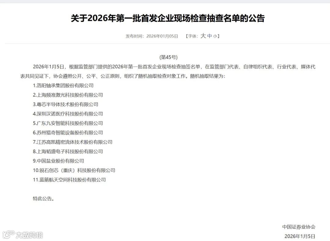 2026年1月5日,中国证券业协会在监管部门代表、自律组织代表、行业代表及媒体代表共同见证下,严格遵循公开、公平、公正原则,完成2026年第一批首发企业现场检查对象随机抽取工作。本次共抽取11家企业,名单如下:
