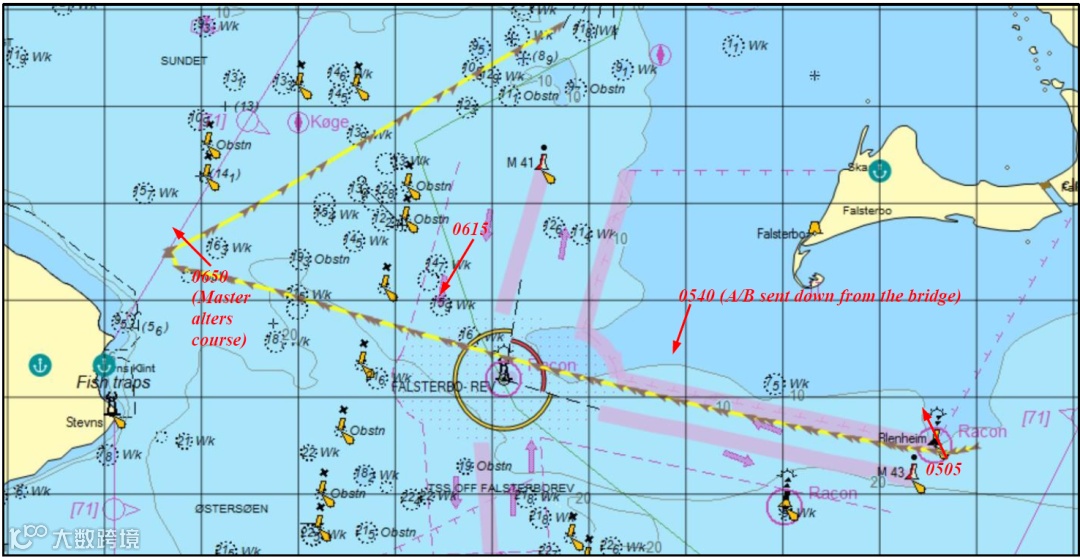 0650时,58岁船长按计划抵达驾驶台,发现大副仍在熟睡,同时船舶已严重偏航、逼近浅滩。船长立即接通VTS与DMAS通信,并右转航向,成功回归计划航线。