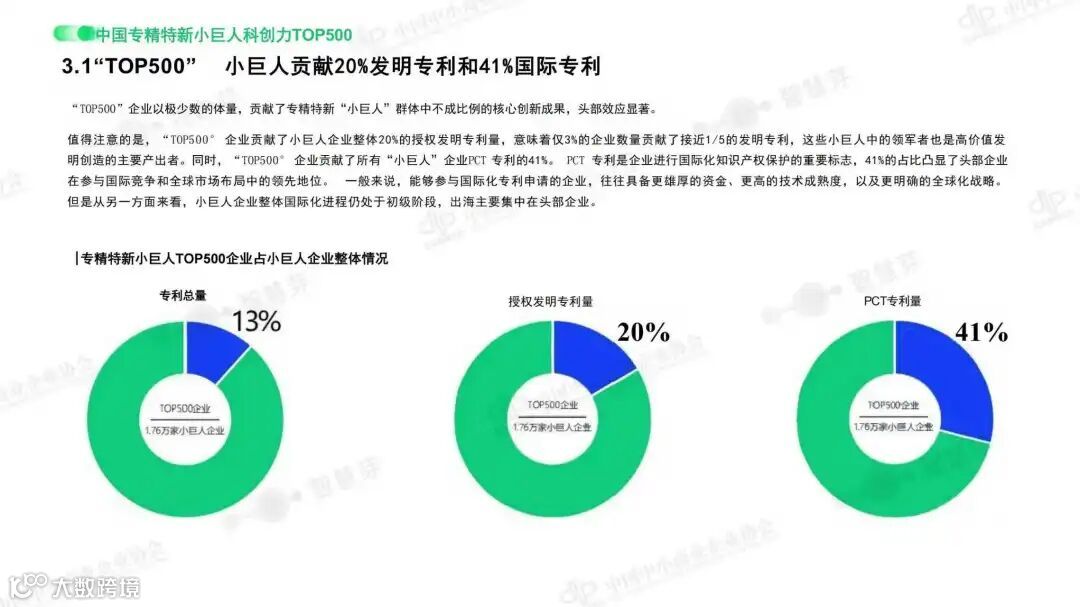《报告》首次发布专精特新小巨人科创力TOP500企业榜单。该群体仅占总量约3%,却贡献了全体“小巨人”20%的授权发明专利和41%的PCT国际专利。