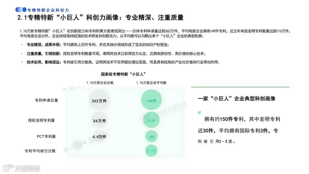 1.76万家“小巨人”企业累计专利申请量达262万件,平均每家149件;近五年有效发明专利116万件,平均每家32件;平均专利被引2.2次,技术产业化价值与行业影响力显著。