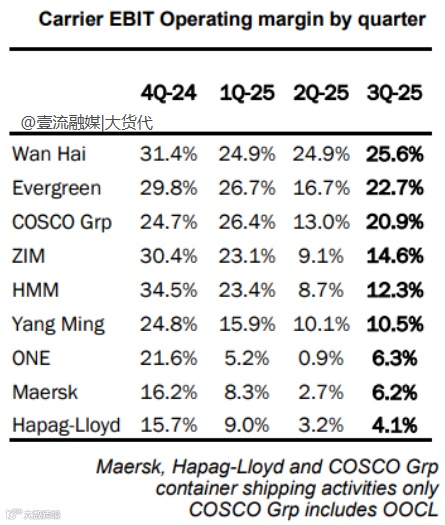 日前,全球知名班轮数据平台Alphaliner发布2025年第三季度全球主要集装箱航运公司盈利报告。数据显示,当季全球主要船司平均营业利润率回升至13.7%,较上一季度的9.9%明显提升,合计息税前利润逾43亿美元。