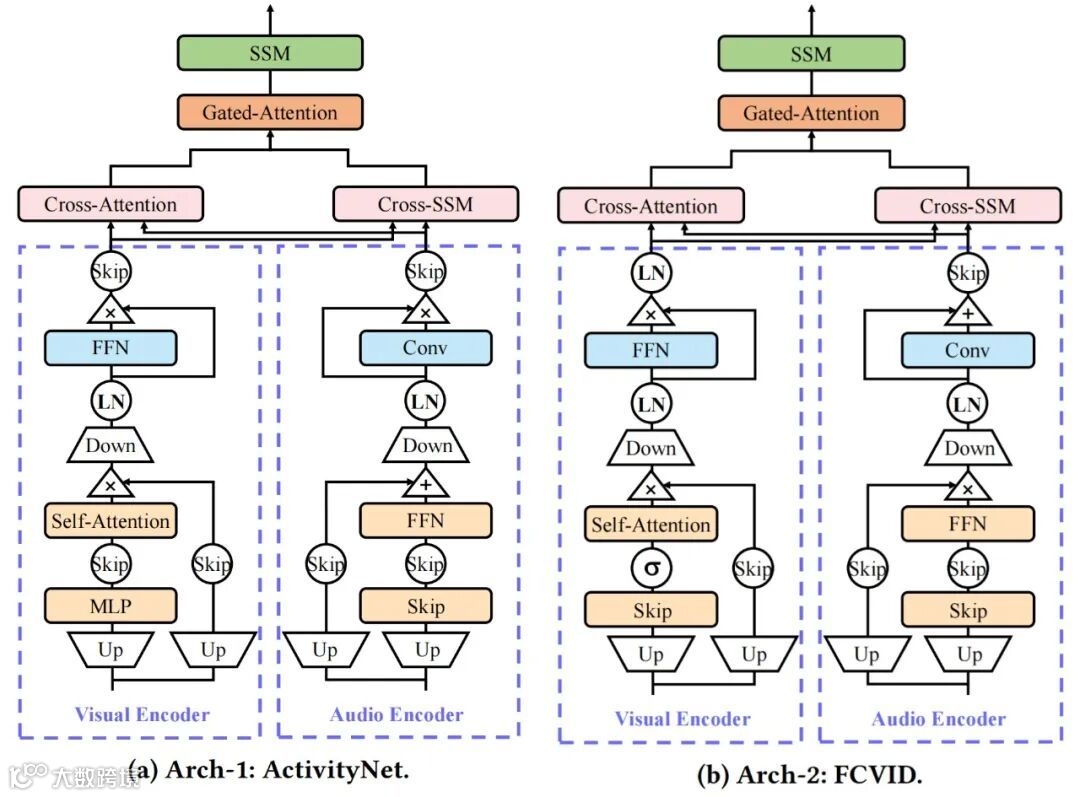 在同一搜索空间下,AV-NAS 在两个数据集上分别获得最优结构 Arch-1(ActivityNet)与 Arch-2(FCVID)。二者 Fusion 与 Transformation 高度一致,差异集中于 Encoder 细节:视觉建模符合专家先验(侧重时空注意力),但音频建模却明显偏向“FFN + CNN”组合,而非主流 Transformer 或 Mamba。