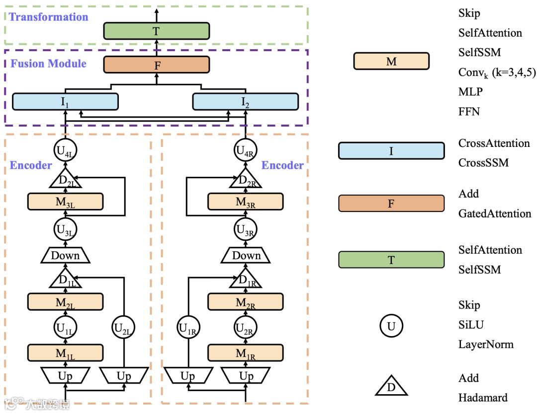 搜索空间由双路 Encoder、Fusion 与 Transformation 三部分组成,涵盖 6 类可选算子:序列建模(M)、跨模态交互(I)、融合(F)、语义变换(T)、一元操作(U)、二元操作(D)。既包含 SelfAttention、CrossAttention、FFN、LN、Skip 等 Transformer 组件,也纳入 SelfSSM、CrossSSM、Up-Down 变换等 Mamba/SSM 元素,并兼容 CNN、MLP、GatedAttention、Add、Hadamard 等通用操作。