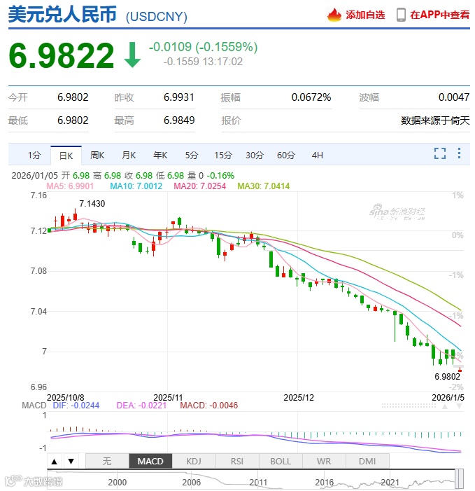 2025年末,人民币汇率强劲反弹。在岸人民币对美元突破14个月高位,逼近6.90关口,年内累计上涨超3.8%;离岸人民币涨幅达4.4%。截至2026年1月5日13时,离岸人民币报6.9782(最低6.9667),在岸人民币报6.9822(最低6.9802)。当日人民币中间价为7.0230,较前一交易日上调58个基点。
