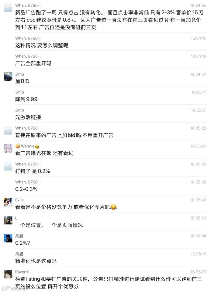 W:新品广告跑了一周,只有点击没有转化,而且点击率非常低,只有2-3%,客单价15刀左右,cpc建议竞价是0.8+,因为广告位一直没有在前三页看见过,所以一直加竞价到1.1左右,广告位还是没有进前三页,这种情况要怎么调整呢?广告全部重开吗?直接在原来的广告上加bid吗?不用重开广告?打错了,点击率是0.2%,0.2-0.3%。