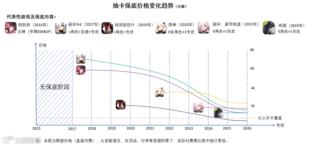 从17年开始,抽卡保底价格从6-8k逐渐降低至2k左右,且不同游戏之间付费差距逐渐减少。而未来价格变化,也逐渐靠拢大小月卡线(即:只需大小月卡+日常活跃,便基本可以覆盖主流角色的抽取成本)。