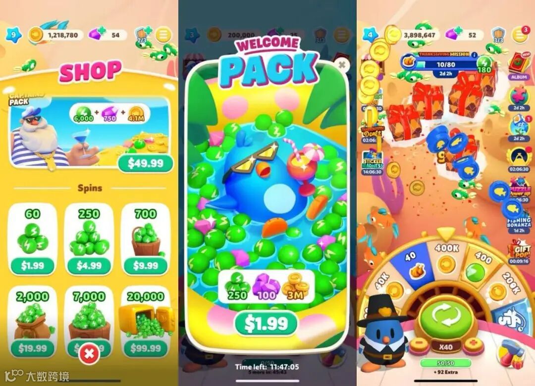 游戏在玩家资源即将耗尽的第一个付费压力点,精准推送定价1.99美元的“Welcome Pack”。该礼包内含250能量、100钻石及300万金币,其资源价值远超任何常规礼包。根据点点数据内购收入分布图,仅“Special Offer 2”(即Welcome Pack)一项,其收入占比就超过50%,是无可争议的收入支柱。