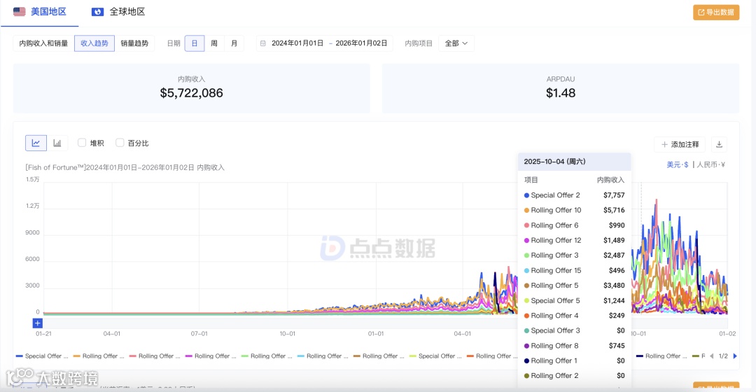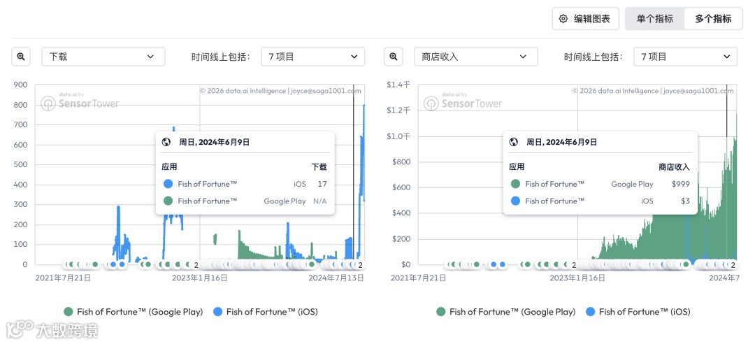 结合Sensor Tower的早期记录与点点数据图表,《Fish of Fortune》的完整成长路径清晰可见,完美印证了其“数据驱动、分段推进”的冷启动策略。