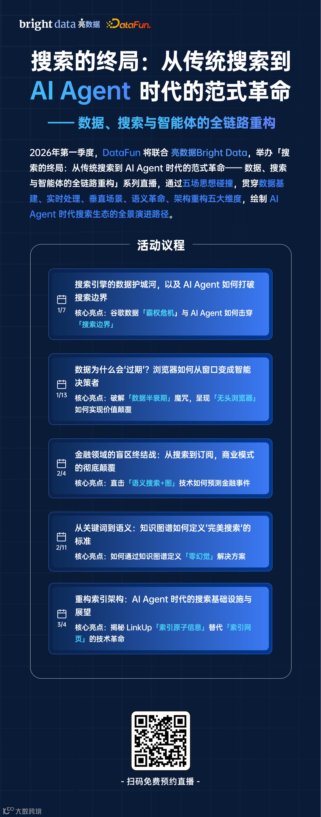 1月7日 19:30-21:00,DataFun联合Bright Data的系列直播月活动第一期,将分享「Google的数据护城河,以及AI Agent如何打破搜索边界——规模与速度的极限挑战」