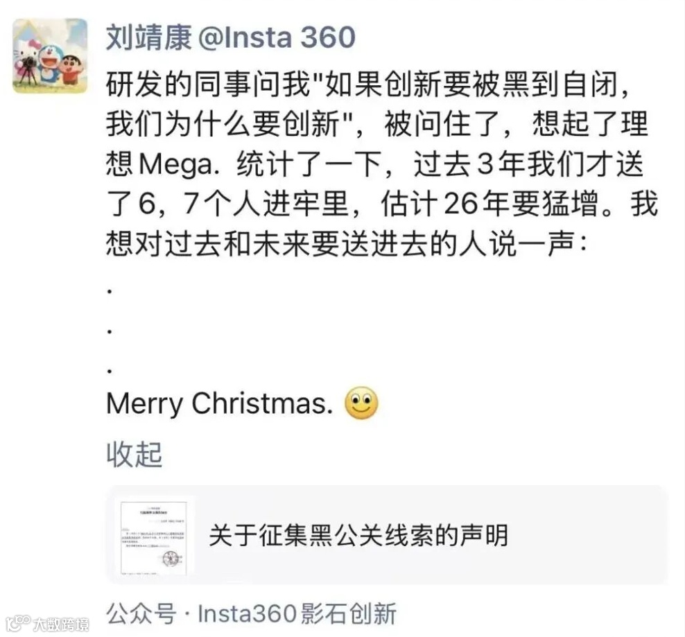 这是影石创新创始人刘靖康在朋友圈发的一段话,字里行间充满火药味。这番表态不仅展现出影石创新面对不正当竞争与网络围剿的态度,同时也意味着当前部分品牌面临的环境已经发生转变——竞争已经从产品、市场的明面交锋,蔓延至舆论乃至供应链等多维度的较量。