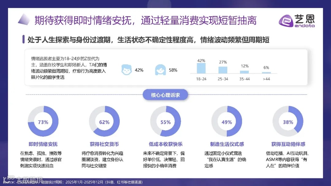 这类人群的核心心理诉求十分明确:73% 追求即时情绪安抚,在焦虑、孤独、挫败等情绪突袭时通过感官刺激快速回血;62% 希望获得社交货币,将疗愈消费转化为兴趣圈层谈资;55% 偏爱低成本快乐,倾向单价低、决策轻、回报快的小确幸消费;49% 渴望互动陪伴感,借助吃播、AI 互动玩具等获得 “有人在” 的体验;38% 注重制造生活仪式感,通过固定小行为营造 “认真生活” 的确定感。