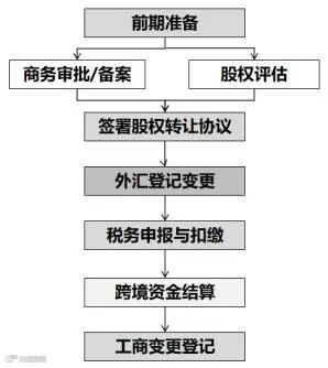 签订股权转让协议→税务申报(个人所得税、印花税)→办理工商登记及商务报告→外汇FDI登记→资金汇入
