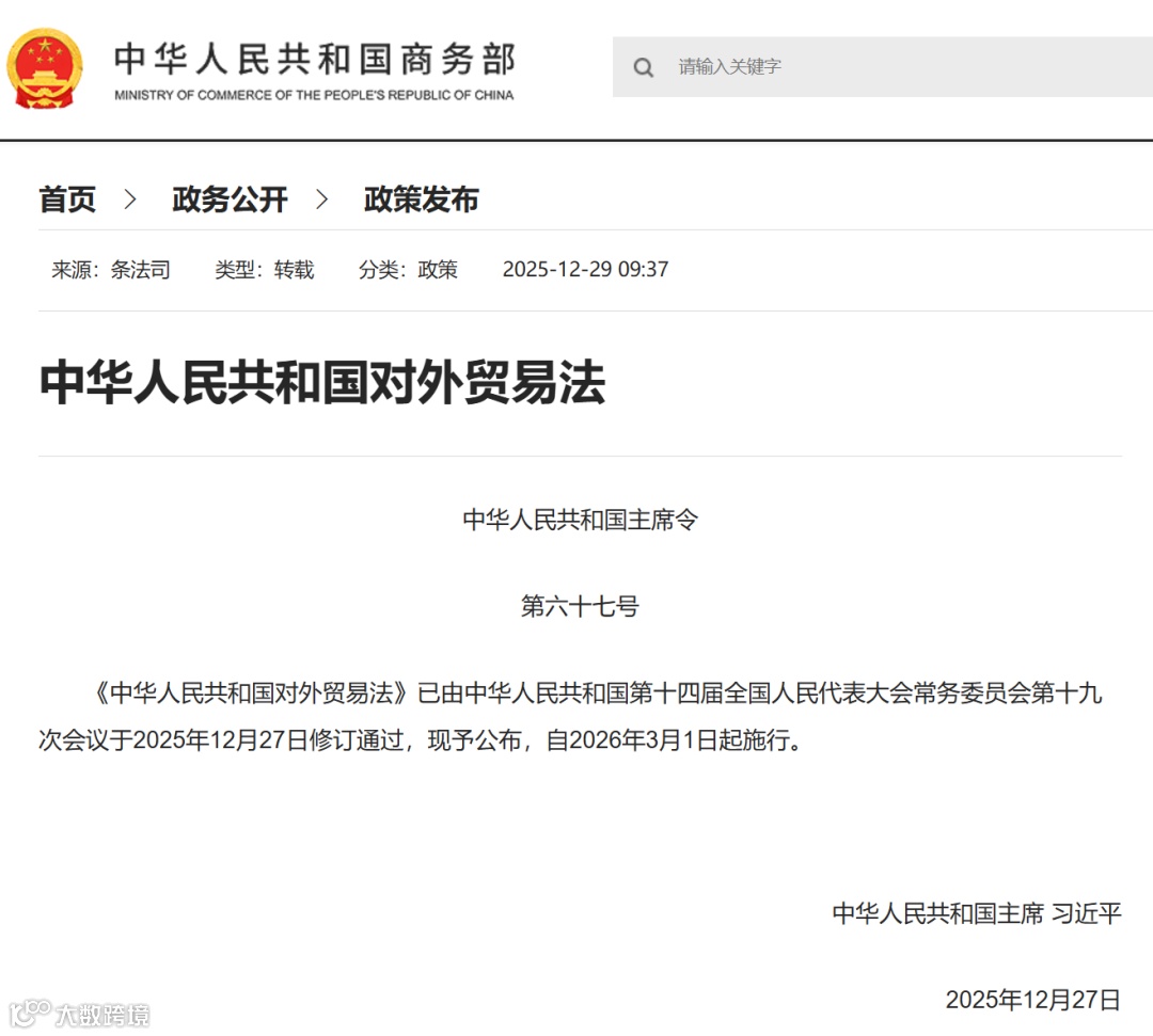 全国人大常委会会议于12月27日表决通过新修订的《中华人民共和国对外贸易法》,自2026年3月1日起施行。