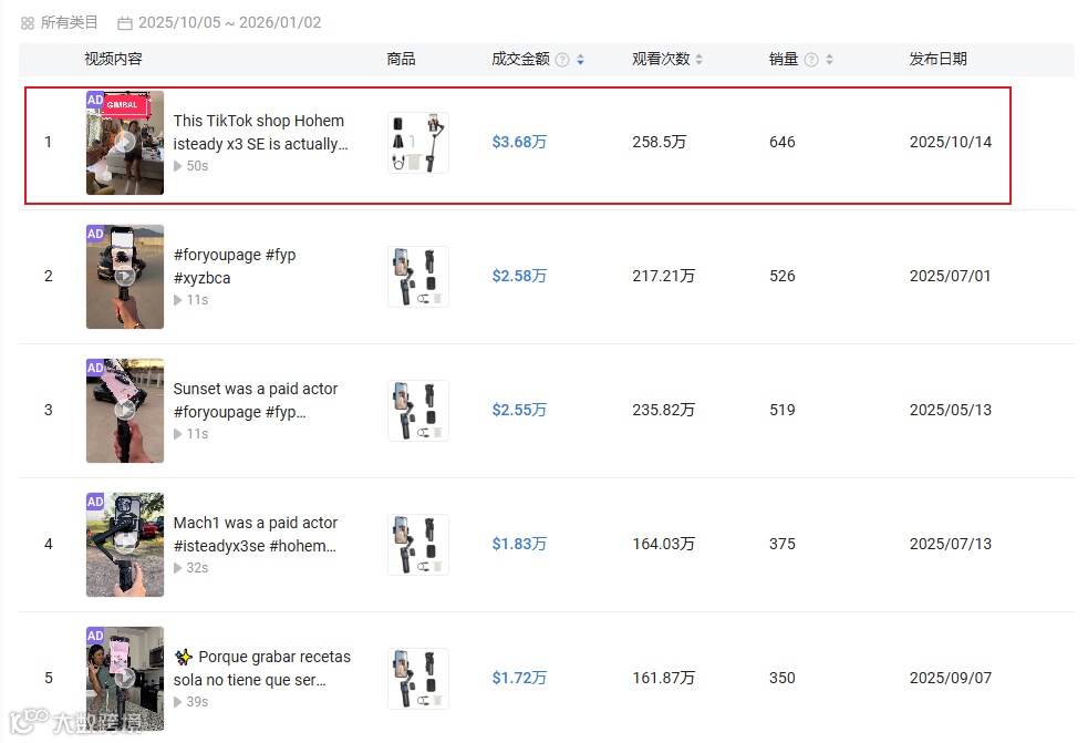 同期,hohem共合作3856名达人,发布带货视频6245条。值得关注的是,粉丝仅1.55万的尾部达人@dannyspiracy单条视频获258.5万播放,带动646单销售,成交额3.68万美元。