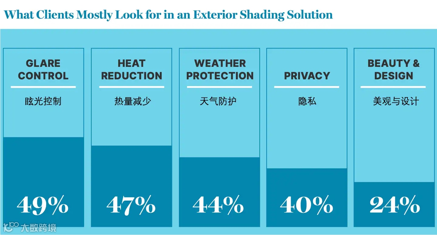 当谈论到“期望户外遮阳产品解决什么问题”时,约49%的受访者表⽰,眩光控制是消费者寻求的⾸要功能,其次是减少热量和防⻛⾬,占比超过44%;虽然⽓候相关因素位居榜⾸,但有40%的受访者也表⽰,隐私是消费者购买户外遮阳产品的⼀个重要因素;对于小部分人(约24%)来说,美感和设计是消费户外遮阳产品主要吸引⼒。