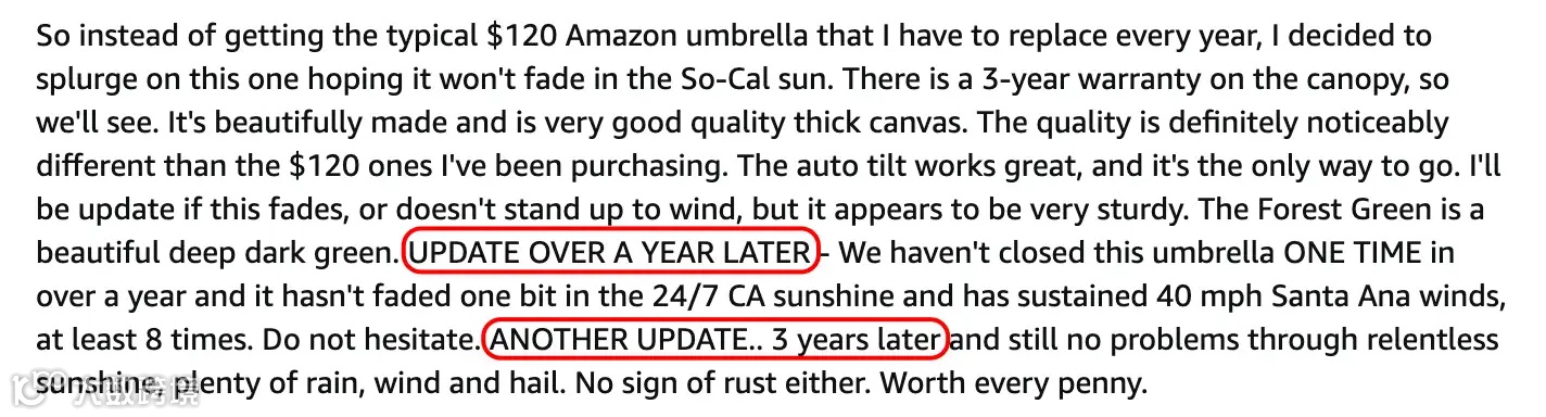 本文围绕庭院遮阳出海这一主题展开观察。下图是一条来自美国亚马逊的庭院遮阳伞的商品评论。在看到它之前,很难想象有人在买完东西的一年后、三年后都去追加好评。试想一下,很大部分原因是这个产品用了这么长时间真的很令人满意,所以“不吐不快”。